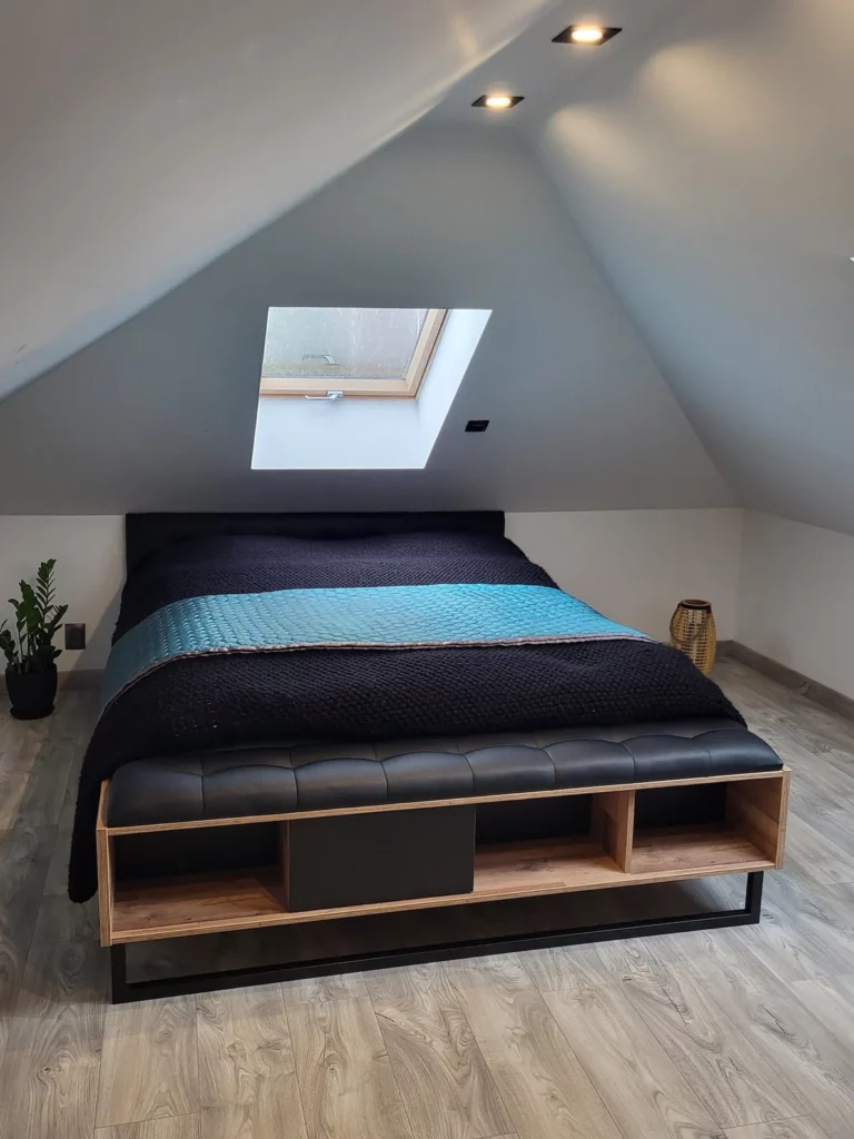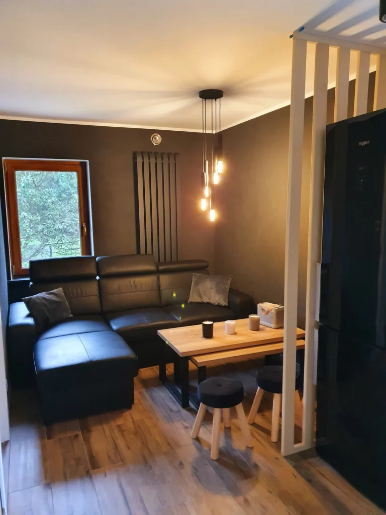 W naszym salonie z miękką, rozkładaną sofą, którą z łatwością zamienia się w dodatkowe miejsce do spania, każdy znajdzie swoją strefę relaksu. Wnętrze ożywiają ciepłe drewniane elementy, tworząc harmonijną przestrzeń do spędzania czasu z bliskimi. To właśnie tu jest umiejscowiona sauna oraz aneks kuchenny. Idealne miejsce na wieczorne rozmowy przy kubku gorącej herbaty;)