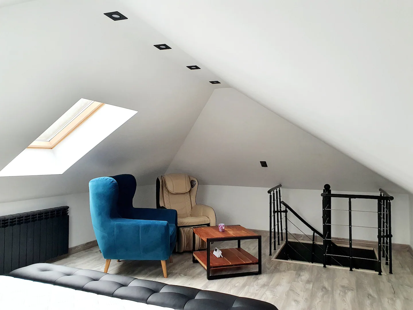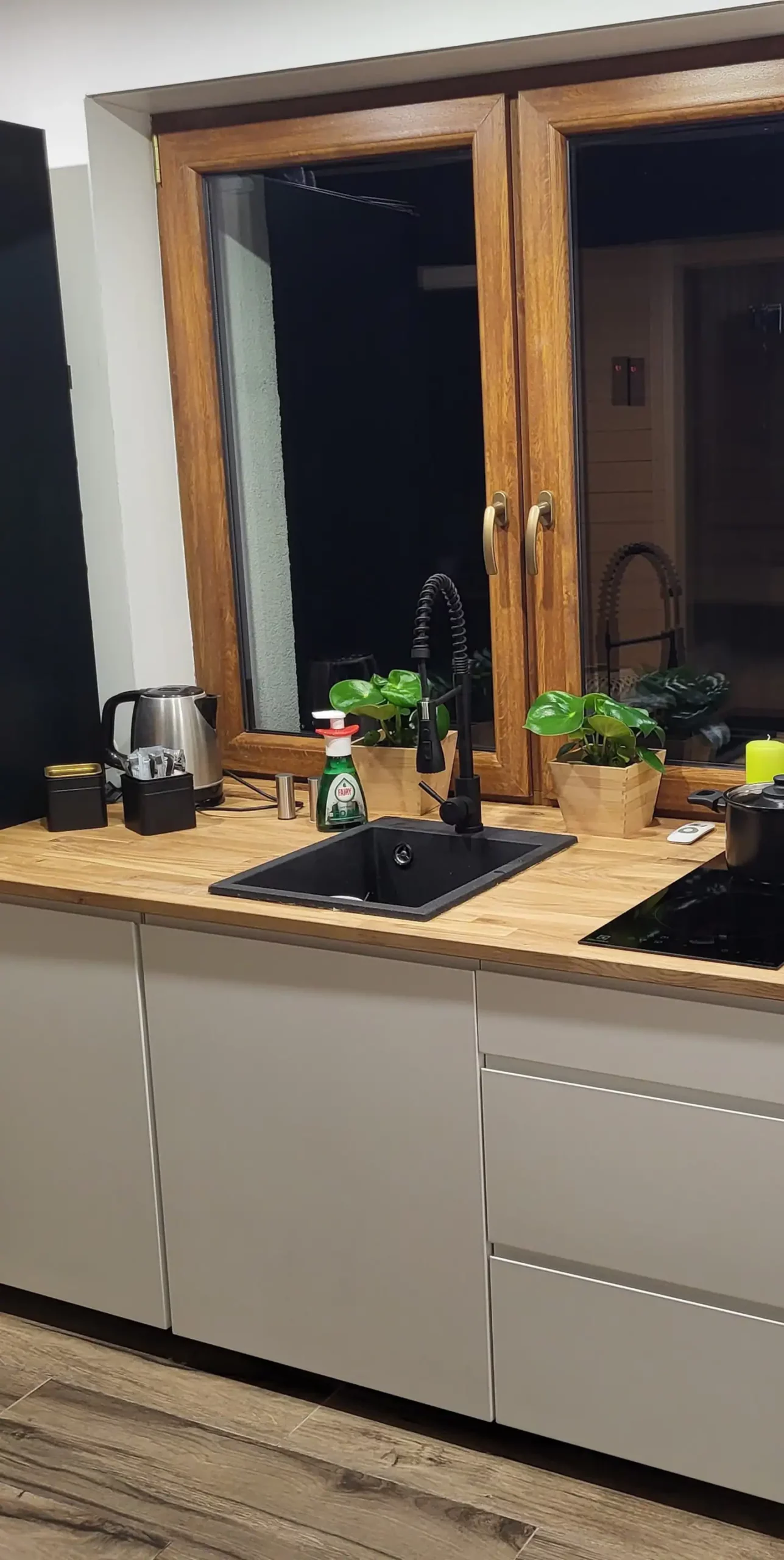 W naszym salonie z miękką, rozkładaną sofą, którą z łatwością zamienia się w dodatkowe miejsce do spania, każdy znajdzie swoją strefę relaksu. Wnętrze ożywiają ciepłe drewniane elementy, tworząc harmonijną przestrzeń do spędzania czasu z bliskimi. To właśnie tu jest umiejscowiona sauna oraz aneks kuchenny. Idealne miejsce na wieczorne rozmowy przy kubku gorącej herbaty;)
